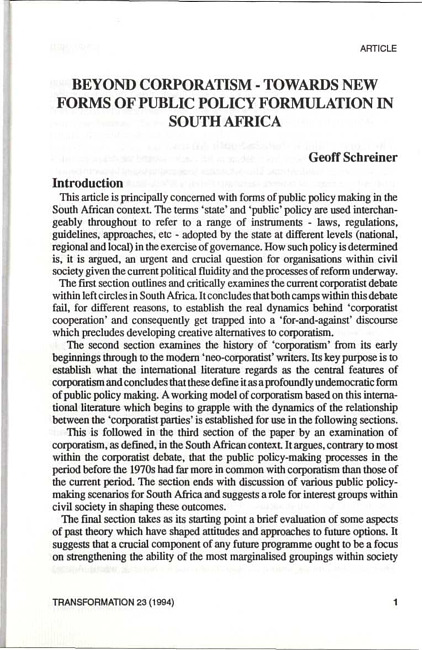 In this journal and elsewhere, corporatism has been explored as a way of understanding new attempts at managing economic conflict and social change in transitional South Africa. Geoff Schreiner explores the limits of this concept and suggests new approaches to understanding the phenomenon.