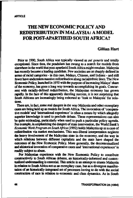 The new economic policy and redistribution in Malaysia : a model for post-apartheid South Africa?