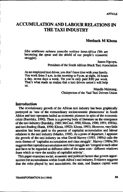 The taxi industry is the source of extraordinarily violent conflict as well as dynamic economic growth in the transport sector. Meshack Khosa argues that the history, not only of apartheid, but of the contradictory processes unfolding in South African capitalism, is unveiled in a study of this industry.
