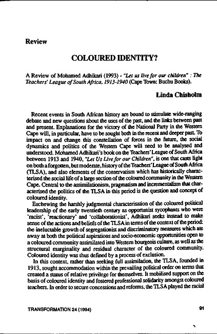 Review of: Mohamed Adhikari. "Let us live for our children". Cape Town: Buchu Books, 1993