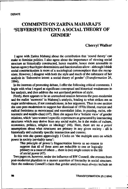 Cherryl Walker feels that Zarina Maharaj has been less subversive and more contradictory than she would like in theorising gender.