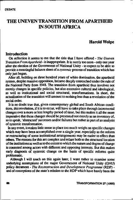 Harold Wolpe examines some of the underlying assumptions of the RDP and picks up on some of the issues developed by Adelzadeh and Padayachee.