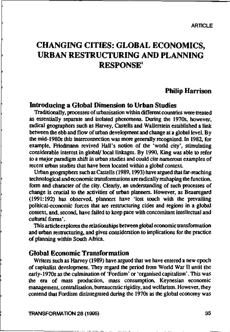 Partnerships and networking, rather than traditional planning approaches, Philip Harrison argues, may offer a more meaningful response to urban restructuring in the context of growing global-local linkages.