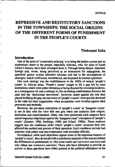 Thokozani Xaba, by drawing a distinction between restitutory and repressive justice, discusses "people's courts" in order to make suggestions about a new system of justice in South Africa.