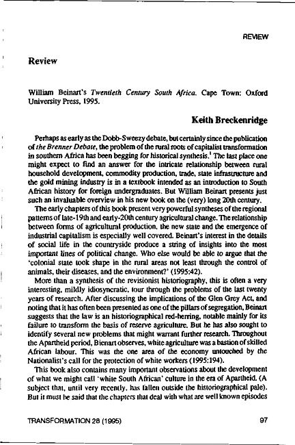 Review of: William Beinart. Twentieth century South Africa. Cape Town: Oxford University Press, 1995
