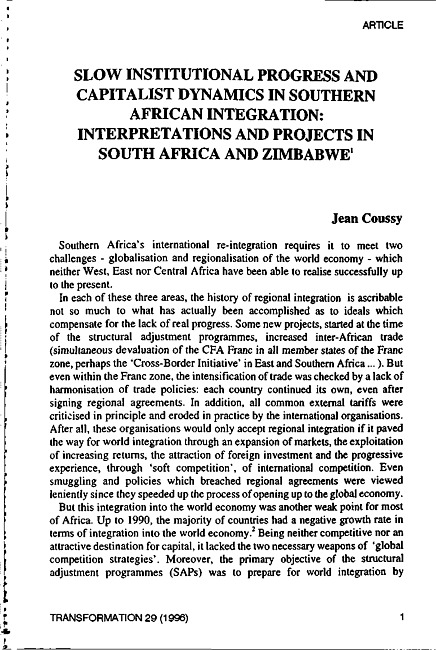 Unlike other parts of this continent, Southern Africa has historically been knitted together into a regional economy. It is ironic, according to a wide-ranging analysis by Jean Coussy, that political liberation is not bringing this process forward on a new basis. He tries to explain why and suggests an alternative policy approach.