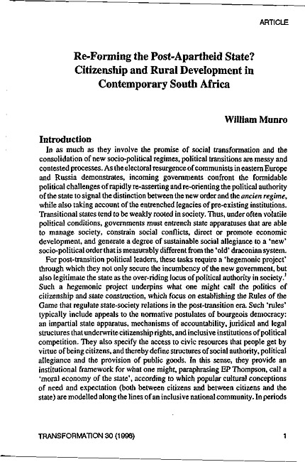 William Munro argues that development literature on South Africa underestimates the importance of the rural development endeavour. This in turn means promoting an effective state presence in rural areas that can incorporate rural people politically while enabling economic and social development to take place. These two processes must be understood as part of a common hegemonic project of transformation. In examining this theme, a critical gaze at development in KwaZulu-Natal is cast.