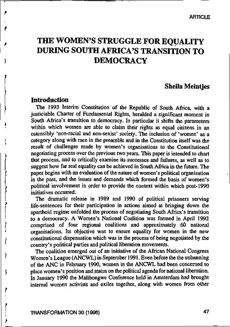 Sheila Meintjes explores the active promotion of women's issues during the transition period of the early 1990s with a focus on the women's charter movement. If this kind of mobilisation was a necessary component for advancing women's causes, it did not necessarily succeed in sustaining momentum once the transfer of power occurred.