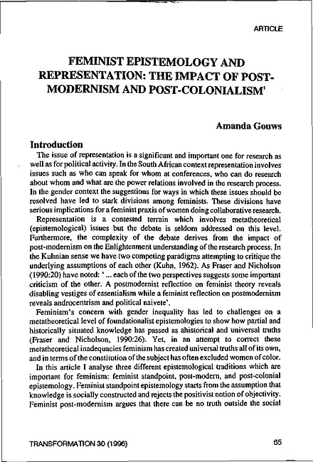 The feminist movement too, argues Amanda Gouws, has been affected by the post-modern "politics of identity" with all-embracing claims being made for experiential legitimacy. Without denying the importance of experience and difference, however, the way towards a more generalised and effective epistemology needs to be found.