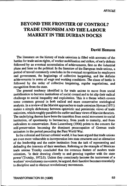 Beyond the frontier of control? Trade unionism and the labour market in the Durban docks
