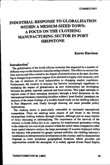 But what actually happens on the ground? Karen Harrison explores the case of the clothing industry in a small town on the KwaZulu Natal coast over the past several years. Here, a generally declining industry has expanded to some extent without dependence on state incentives.