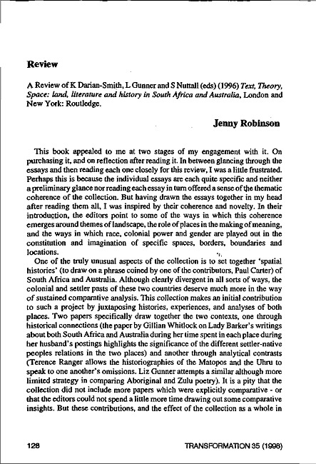 Review of: Kate Darian-Smith, Liz Gunner & Sarah Nuttall (eds).Text, theory, space. London and New York: Routledge, 1996