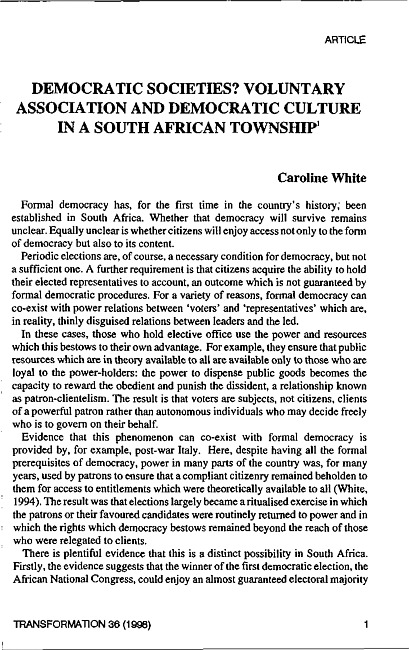 Caroline White proposes a deeper look at the realities of South African democracy. If democracy depends not merely on formal political institutions but on vibrant popular association from below, how does a South African township look today?
