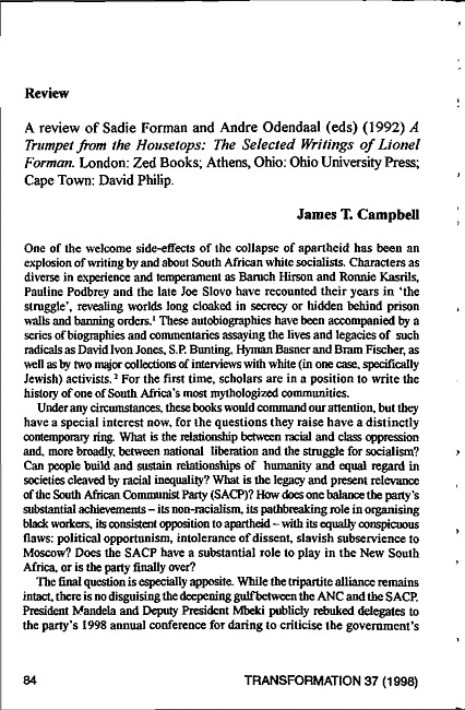 Review of: Sadie Forman & André Odendaal (eds). A trumpet from the housetops. London: Zed Books; Athens, Ohio: Ohio University Press; Cape Town: David Philip, 1992