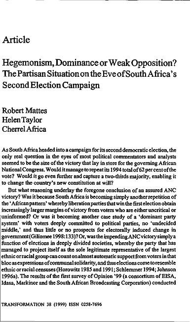 Hegemonism, dominance or weak opposition? The partisan situation on the eve of South Africa's second election campaign