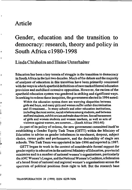 Linda Chisholm and Elaine Unterhalter examine the theoretical and methodological perspectives which have characterised recent research on education and gender in South Africa and some of the policies informed by these approaches being developed at national and provincial level. They also discuss some of the important silences in this research area and the problems that could arise from these gaps.