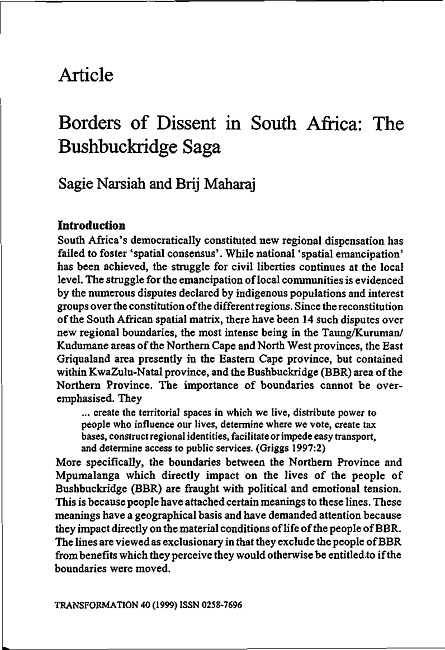 Border disputes did not end with apartheid. Sagie Narsiah and Brij Maharaj examine the saga around the Bushbuckridge region, and the central state's role in local-level politics and mobilisation.