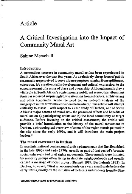 Sabine Marschall examines mural art, and discusses the various types of such painting. She questions, drawing on interviews, why it should have different impact in different situations.