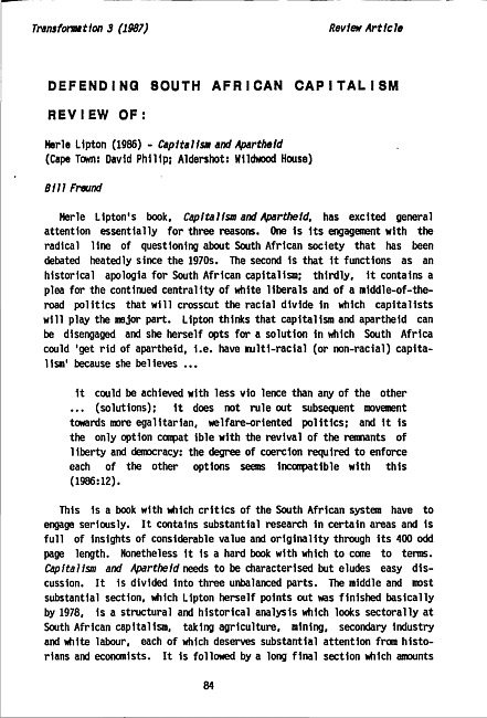 Review of: Merle Lipton. Capitalism and apartheid. Cape Town: David Philip, 1985