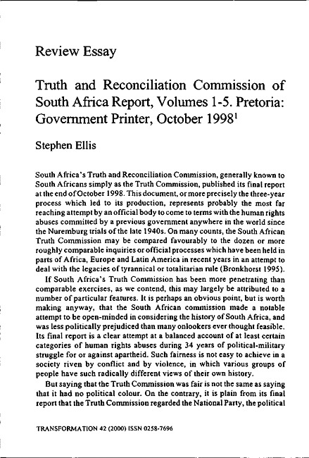 Stephen Ellis reviews the TRC's final report and deems it both a balanced account of at least certain categories of human rights abuse and as a major historical document.