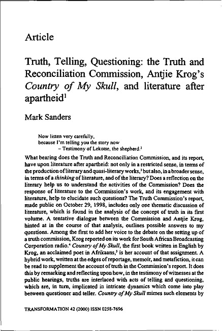 Truth, telling, questioning : the Truth and Reconciliation Commission, Antjie Krog's Country of my skull, and literature after apartheid