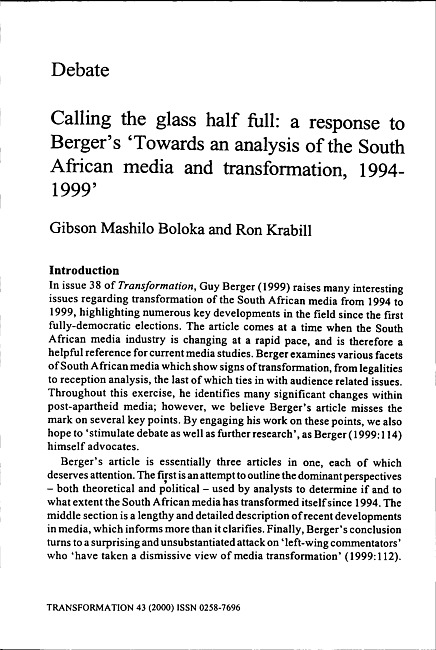 Calling the glass half full : a response to Berger's "Towards an analysis of the South African media and transformation, 1994-1999"