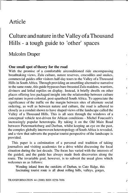 This article by Malcolm Draper looks at places, such as Thor Chemicals, The Valley Trust and Camelot, which lie along the route between Cato Ridge and Hillcrest in the Valley of a Thousand Hills, which he maintains yield insight into the problematic relationship between culture and nature in very different ways.