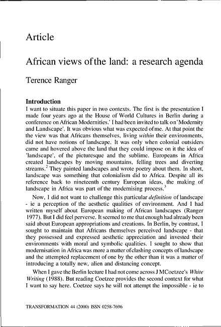 Terence Ranger suggests a research agenda for scholars working on African landscape which encourages investigation of African perceptions of landscape, and thereby greater understanding of crucial struggles for resources, memories and rights.