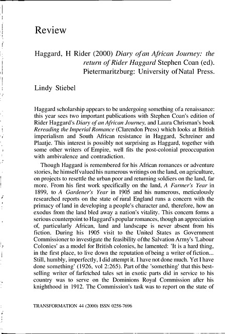 Review of: H. Rider Haggard. Diary of an African journey. Pietermaritzburg: University of Natal Press, 2000