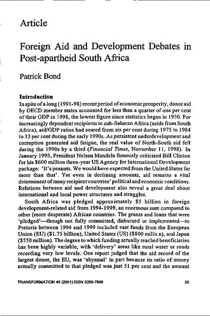 Development debates have largely raged around state policy, the RDP and GEAR, Patrick Bond suggests, however, that a critical analysis of the role of foreign development aid to South Africa is apposite and important.