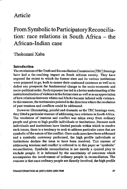 From symbolic to participatory reconciliation : race relations in South Africa--the African-Indian case