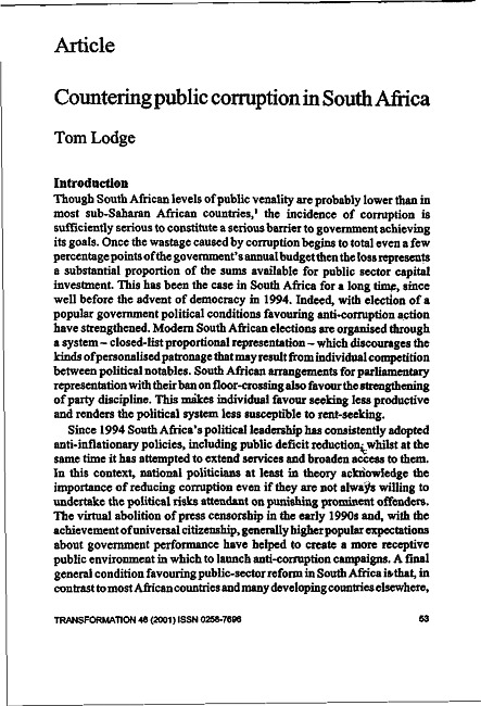 Tom Lodge assesses the state of the literature on, and investigates the post-apartheid government's initiatives against, corruption in South Africa.