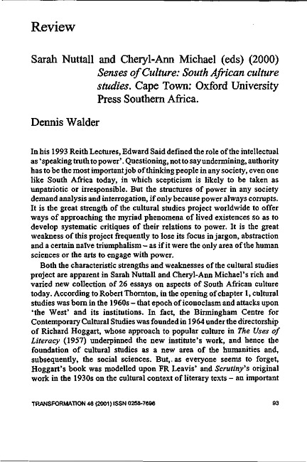 Review of: Sarah Nuttall & Cheryl-Ann Michael. Senses of culture. Cape Town: Oxford University Press, 2000