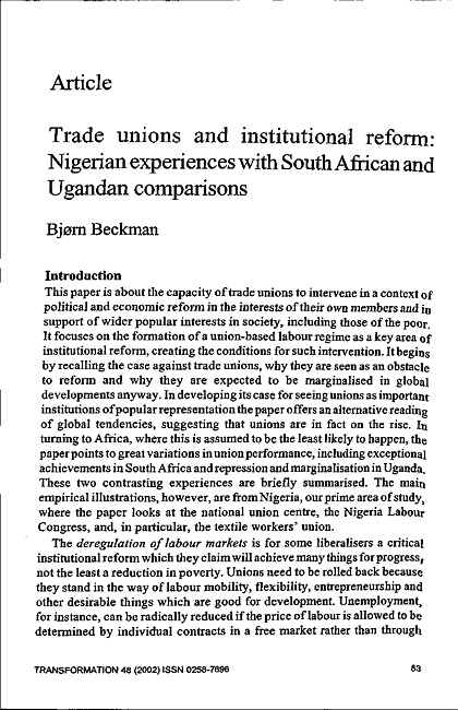 Björn Beckman writes on the capacity of trade unions to intervene in a context of political and economic reform. Contrasting experiences of South Africa and Uganda are summarised, as well as illustrations drawn from Nigeria.