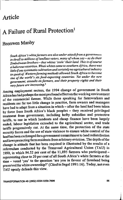 Bronwen Manby examines violent crime on the South African farm as well as government responses to this type of crime, in the shape of the "rural protection plan". She argues that while there are deficiencies in the response to violent crime against farm owners, the system has tended to favour protection of farm owners over other farm residents.
