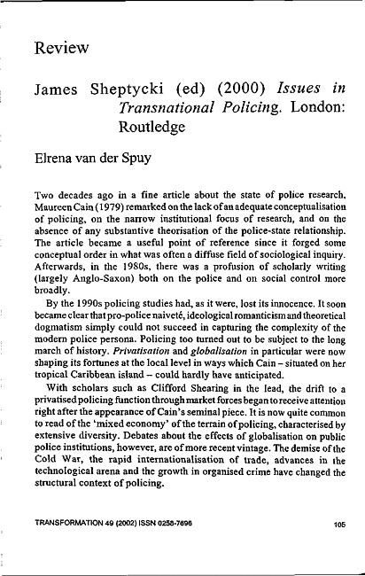 Review of: James Sheptycki (ed.). Issues in transnational policing. London: Routledge, 2000