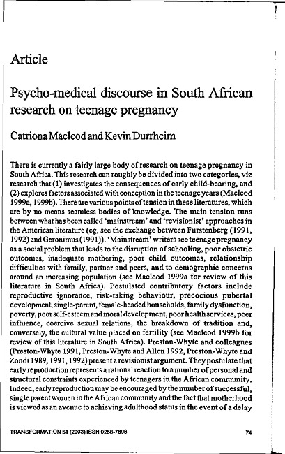 Psycho-medical discourse in South African research on teenage pregnancy