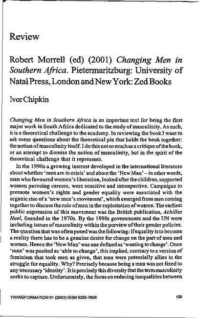 Review of: Robert Morrell (ed.). Changing men in Southern Africa. Pietermaritzburg: University of Natal Press; London & New York: Zed Books, 2001