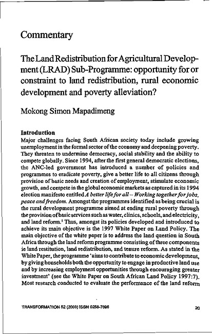 The Land Redistribution for Agricultural Development (LRAD) Sub-Programme : opportunity for or constraint to land redistribution, rural economic development and poverty alleviation?