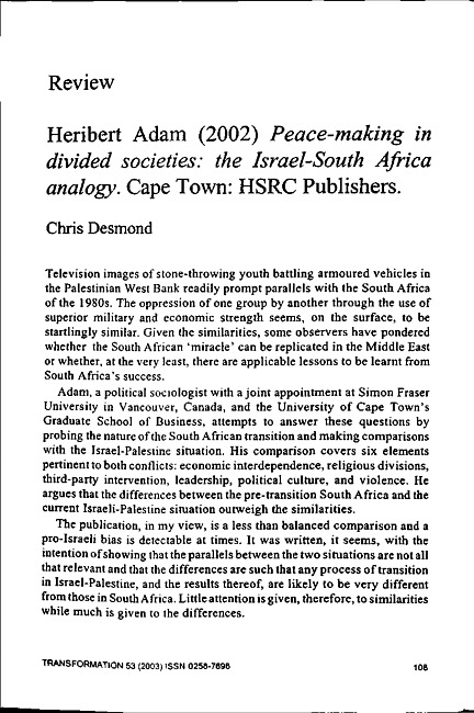 Review of: Heribert Adam. Peace-making in divided societies. Cape Town: Human Sciences Research Council Publishers, 2002