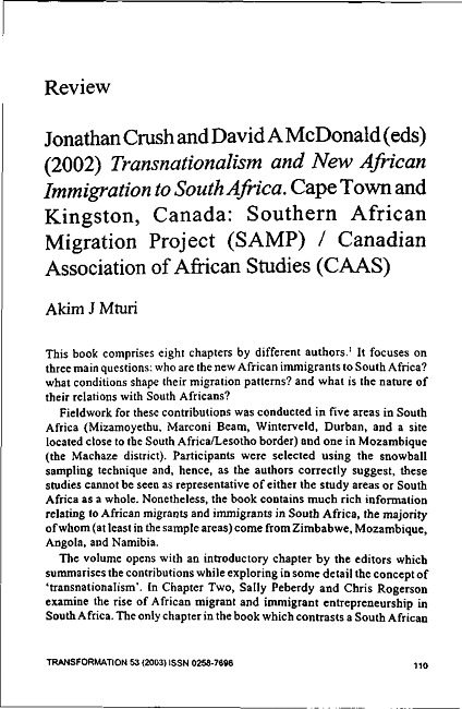 Review of: Jonathan Crush & David A. McDonald (eds). Transnationalism and new African immigration to South Africa. Cape Town & Kingston: Southern African Migration Project, and Canadian Association of African Studies, 2002
