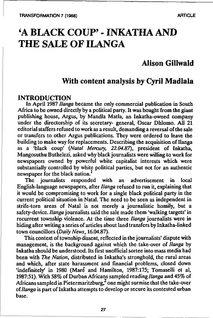 The black press in South Africa influences hundreds of thousands of readers in English and indigenous languages. The author considers the Durban-based and Inkatha-owned newspaper Ilanga and how it appears to succeed despite the political odds.