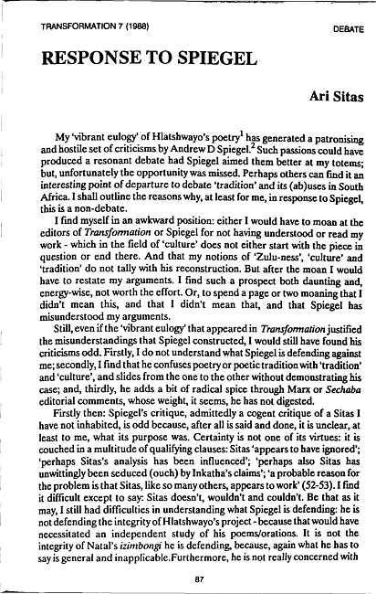 Andrew Spiegel's repfy (Transformation no. 6 1988) to Sitas' contribution on worker poetry in Natal receives a reply from SITAS in turn.
