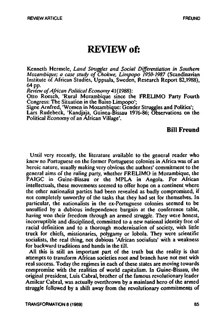 Review of: Kenneth Hermele. Land struggles & social differentiation in southern Mozambique. Uppsala: Scandinavian Institute of African Studies, 1988; Review of African political economy, vol. 41, 1988