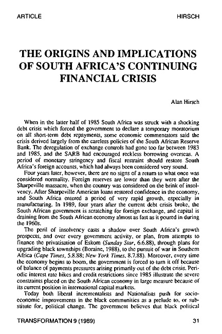 This article acknowledges that movement in the South African political process has to an important extent shifted to the international arena. The author explains the history and meaning of South Africa's debt crisis.