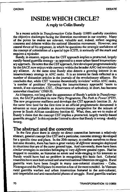 The author contests Colin Bundy's recent characterisation of the inapplicability of colonialism of a special type theory to South Africa.