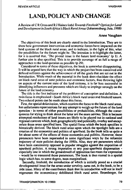 Review of: C.R. Cross, R.J. Haines (eds). Towards Freehold? Johannesburg: Juta, 1988