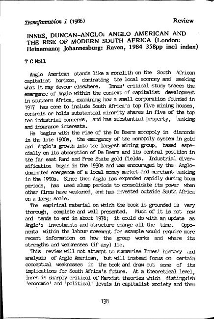 Review of: Duncan Innes. Anglo American and the rise of modern South Africa. London: Heinemann Educational, 1984