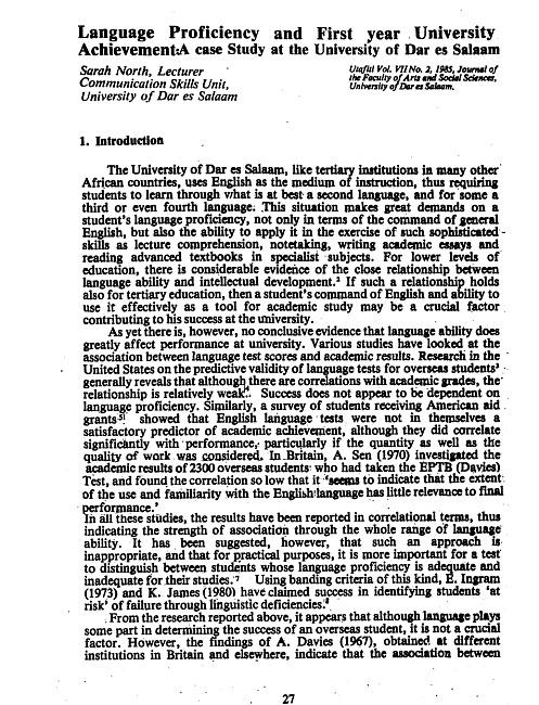 Language proficiency and first year university achievement : a case study at the University of Dar es Salaam