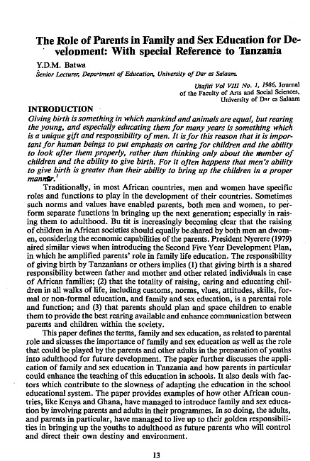 The role of parents in family and sex education for development : with special reference to Tanzania